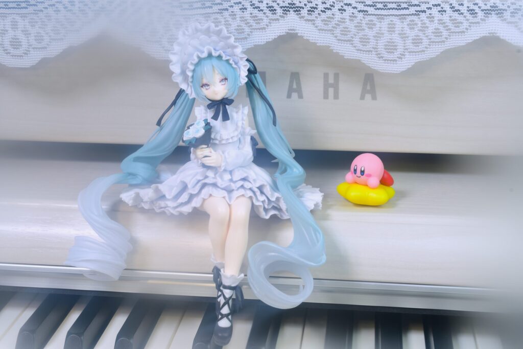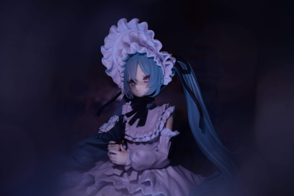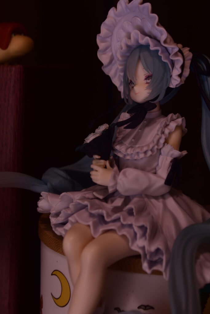 フィギュアはとても可愛いかったのですが、上記のような理由で、我が家のミクさんは暗いシーンでの撮影となりました。