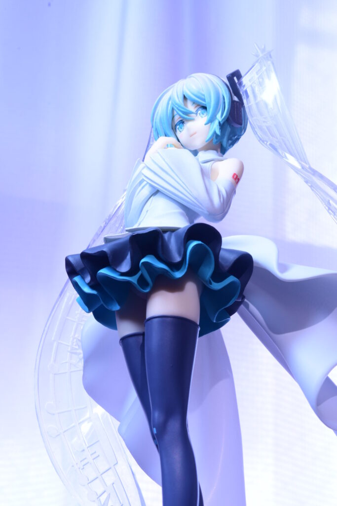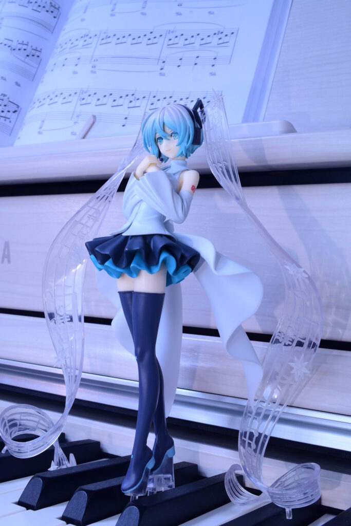 このミクさんは、ササノマリイ氏とRella氏のコラボレーション楽曲「Little Missing Stars」のミュージックビデオに登場するツインテール五線譜Ver.で、儚げな微笑みがなんとも心惹かれるデザインです。